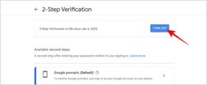 Προσπαθήστε λοιπόν να βρείτε μια συσκευή που έχετε χρησιμοποιήσει για να συνδεθείτε στο Google στο παρελθόν. Εάν πρόκειται για μια αξιόπιστη συσκευή, μπορείτε να συνδεθείτε χωρίς 2FA. Μόλις συνδεθείτε, μεταβείτε στο Ρυθμίσεις Λογαριασμού Google > Ασφάλεια > Επαλήθευση σε 2 βήματα για να απενεργοποιήσετε το 2FA.