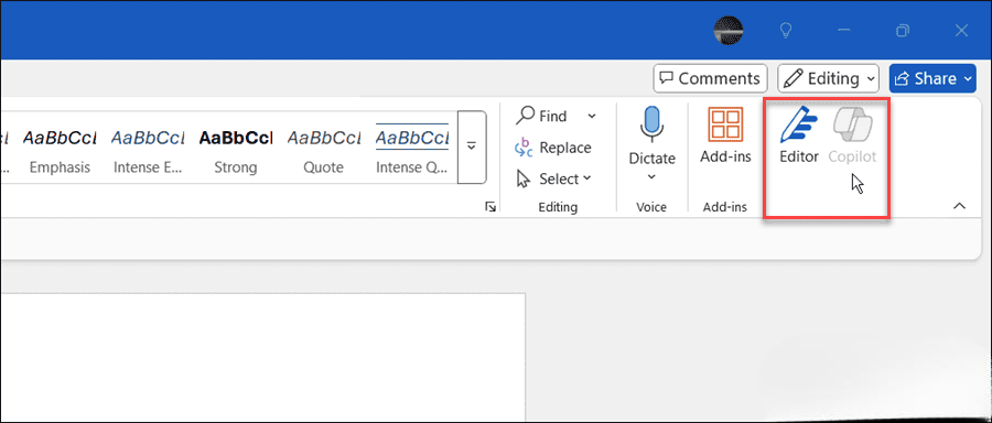 2. Μόλις ακολουθήσετε τα βήματα, το Copilot είναι απενεργοποιημένο. Ωστόσο, το κουμπί θα εξακολουθεί να εμφανίζεται στην κορδέλα, αλλά θα είναι γκριζαρισμένο και δεν μπορεί να χρησιμοποιηθεί. Σημείωση : Εάν το κουμπί είναι ακόμα ενεργό, κλείστε το Word και επανεκκινήστε το.