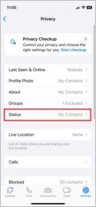 Το WhatsApp έχει ρυθμίσεις απορρήτου Status που καθορίζουν ποιος μπορεί να δει την Κατάσταση, παρά το γεγονός ότι τα άτομα βρίσκονται ο ένας στη λίστα επαφών του άλλου. Για να διαχειριστείτε τις ρυθμίσεις απορρήτου για την κατάσταση WhatsApp: