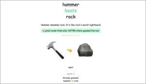 Αυτό το παιχνίδι είναι σαν το κλασικό Rock, Paper, Scissors, αλλά με τεχνητή νοημοσύνη. Ξεκινά ρωτώντας, “Τι ξεπερνά το Rock;” Μπορείτε να πληκτρολογήσετε Χαρτίαλλά μπορείτε επίσης να γίνετε δημιουργικοί και να πείτε οτιδήποτε θα μπορούσε λογικά να το ξεπεράσει, π.χ Σφυρί. Στη συνέχεια, το παιχνίδι συνεχίζεται ρωτώντας, “Τι κερδίζει το Hammer;” Ίσως απαντήσετε με κάτι σαν Φωτιάκαι συνεχίζει από εκεί-Βράχος < Σφυρί < Φωτιά < Άνεμος < Τοίχος < Nuke < Αστεροειδήςκαι ούτω καθεξής.