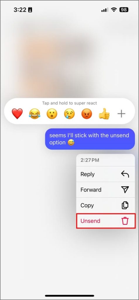 Ευτυχώς, το Instagram δεν έχει χρονικό όριο για την μη αποστολή απευθείας μηνυμάτων. Μπορείτε να αφαιρέσετε μηνύματα που στάλθηκαν πριν από εβδομάδες, μήνες ή και χρόνια. Το μήνυμα αφαιρείται από το ιστορικό συνομιλιών σαν να μην στάλθηκε ποτέ.